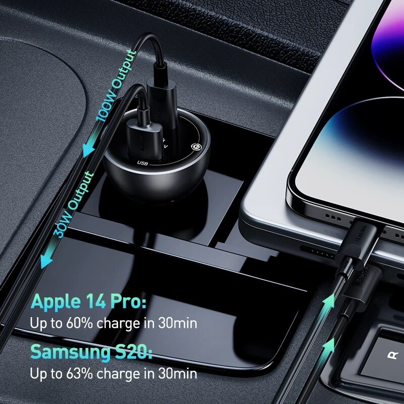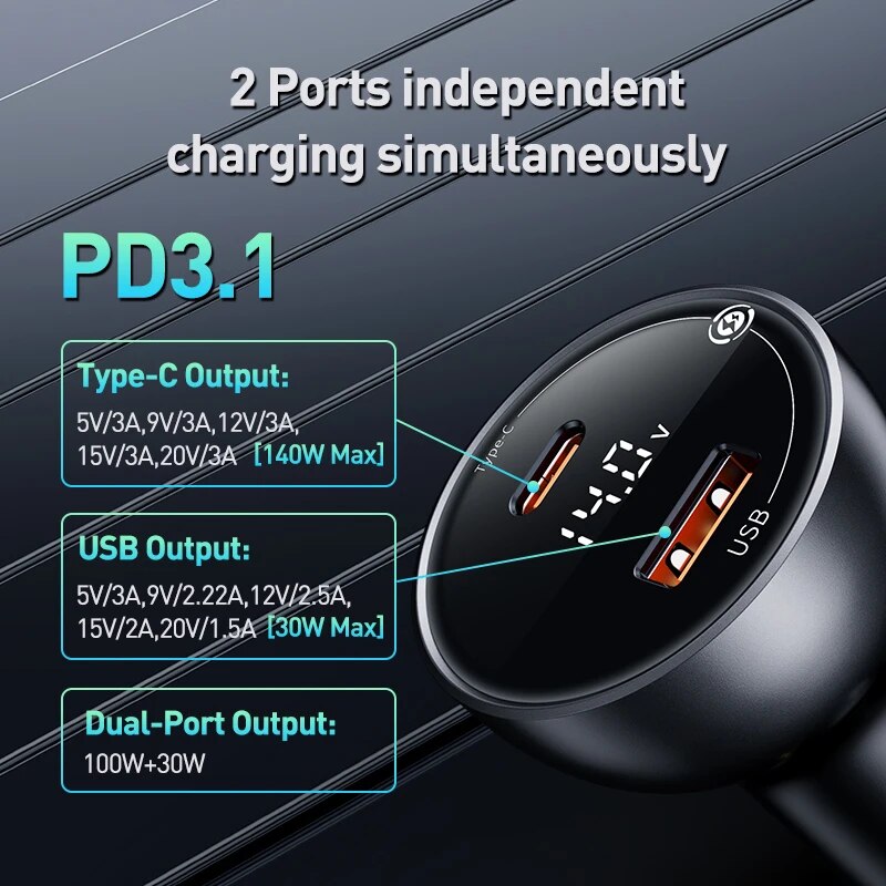 Featuring advanced quick charge technology, this car charger supports both USB PD 3.1 and QC 3.0 protocols for ultra-fast, efficient charging. The 140W total output ensures that even the most power-hungry devices, like your MacBook Pro or other laptops, get charged at full speed. With multiple ports, including a Type-C and a USB-A output, you can charge up to two devices simultaneously without sacrificing charging speed. Whether you’re charging your smartphone, tablet, or laptop, this charger has the power to get you back to full charge in no time.