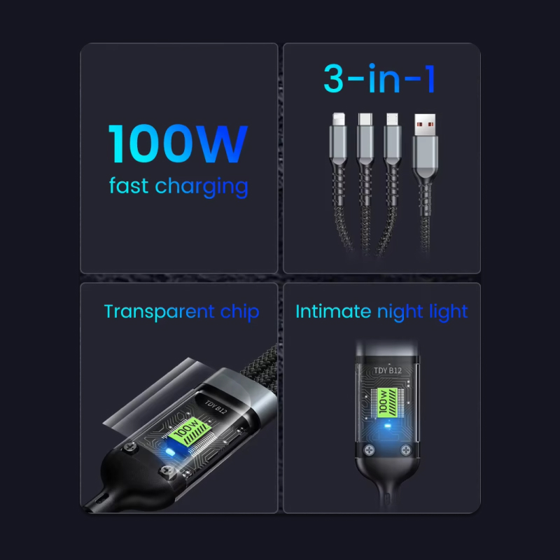 Upgrade your charging experience. Order the 3-in-1 100W Fast Charging Cable today and power your devices with ease!