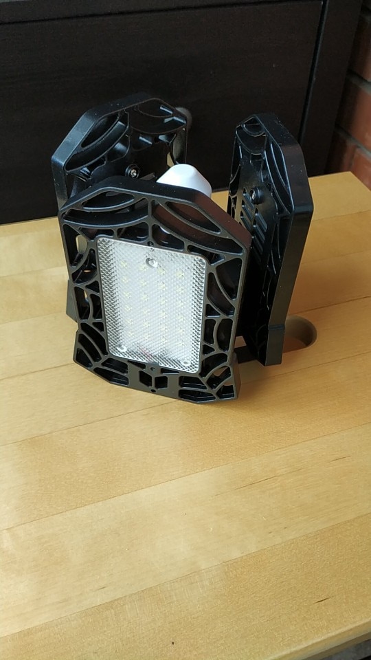 This is an amazing light. It brightens up my garage like if it was daylight. I bought this for the garage in my cottage, but decided to try it out at my condo. Since i didn't have a ceiling socket (only have a 3 foot neon), i tried putting it in place of the garage door opener bulb. I removed the bulb cover of the opener and screwed in the new light. The directionnal adjustable panels allow you to send the light where needed. This so bright that after it's on, turning the neon light on doesn't even make a difference. I'm going to have to leave this there and buy a second one for my cottage...