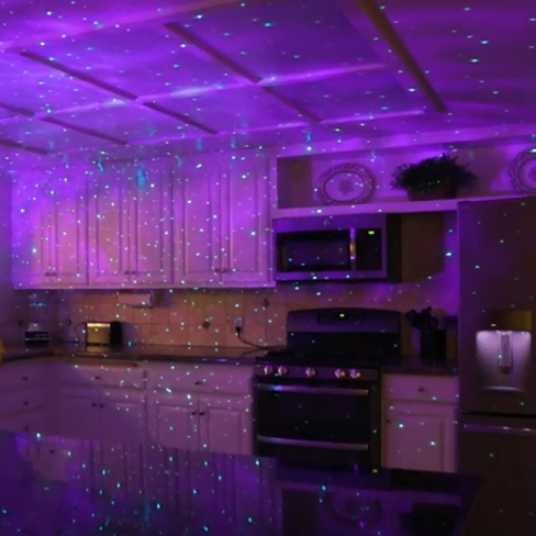 Throws up quite a bit of nice effects wherever it is pointed. The further away from the target the wider the spread of stars and such. Our granddaughter loved the stars on the ceiling effect. It runs quite a long time on a USB battery, so it's extremely portable! I used it during a BBQ party and lit up our outside area. Very cool and well made.